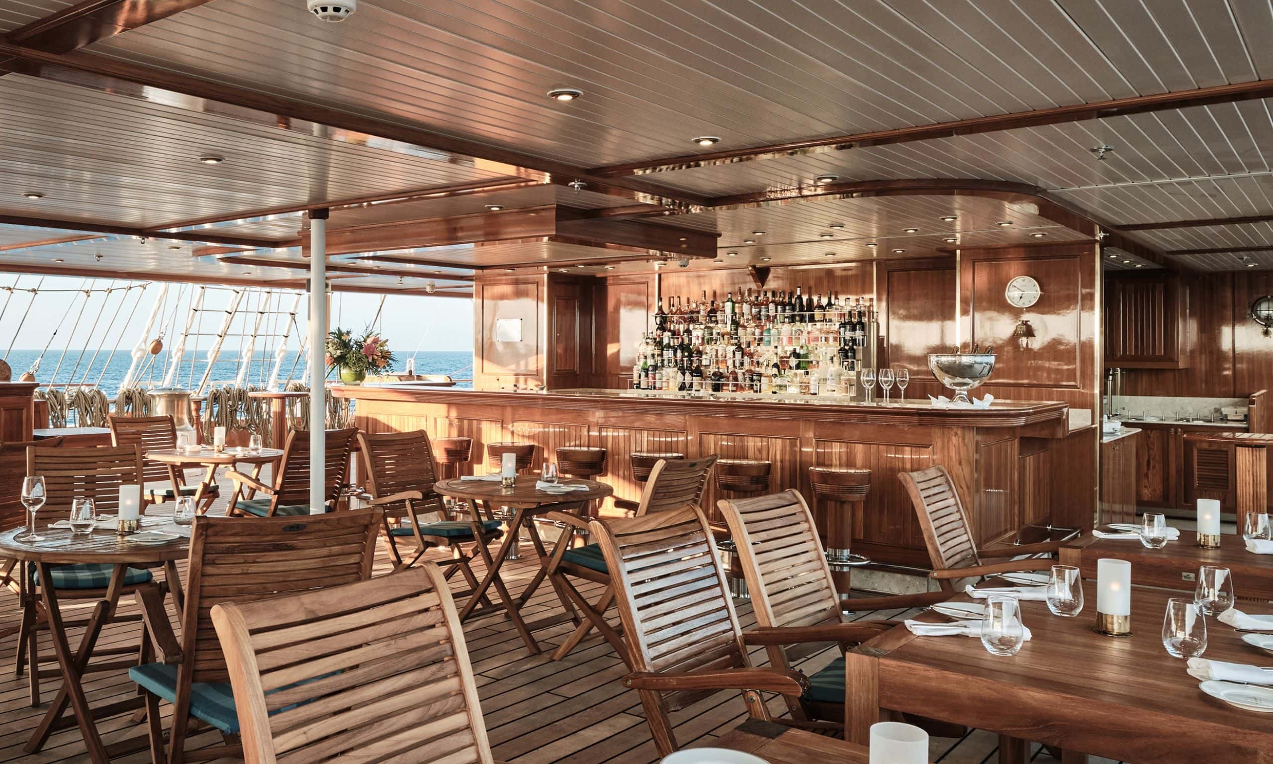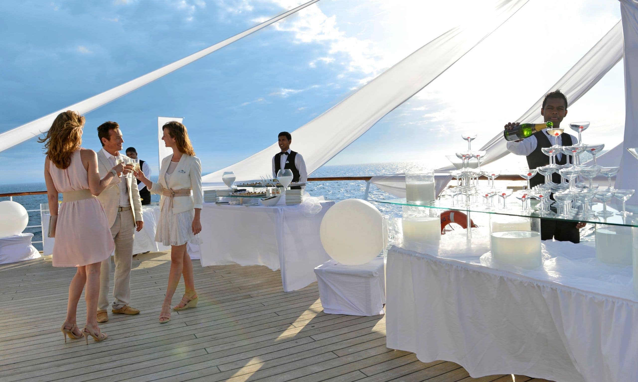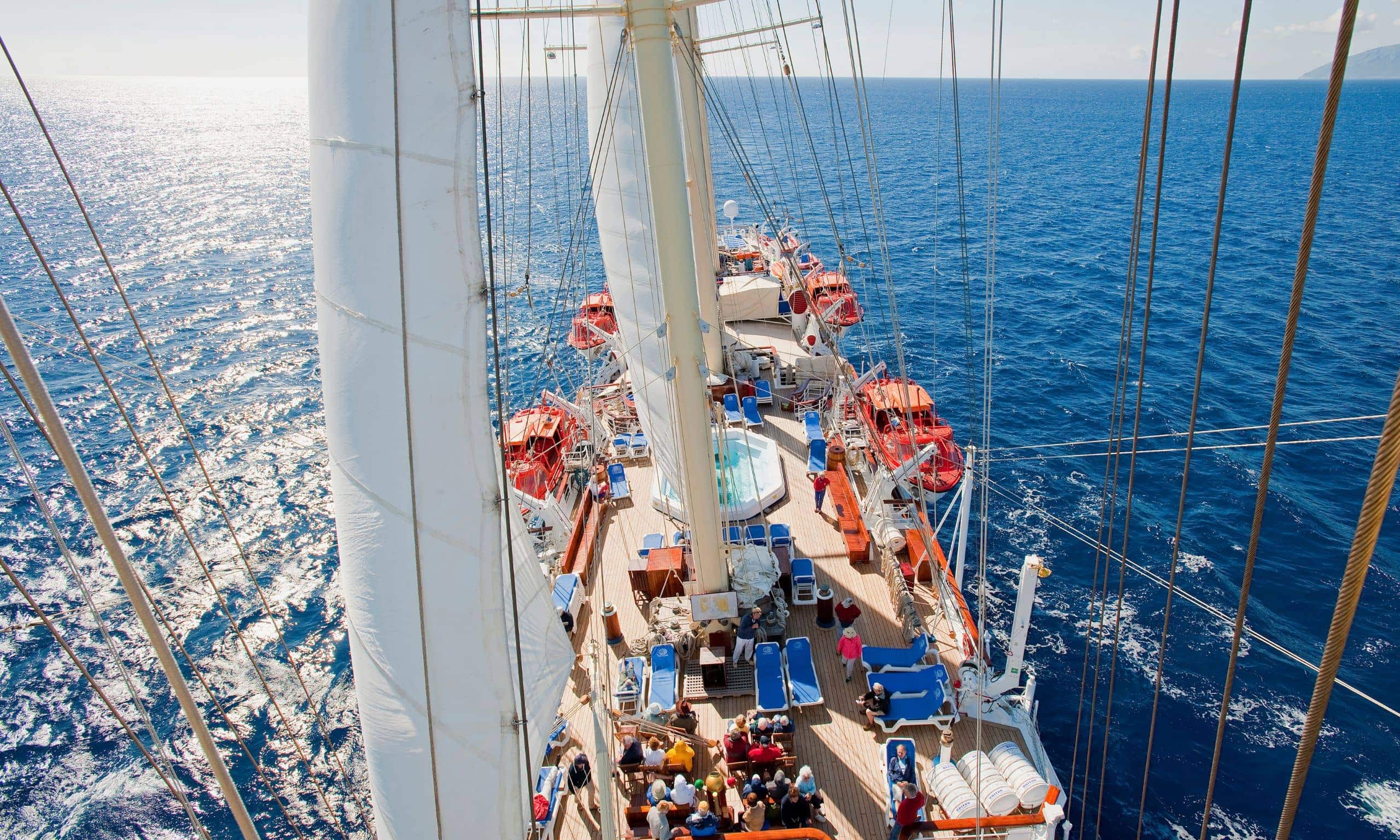Do you want your next company event or incentive to be different than ever before? Not a classic hotel for 30 or 300 guests, not a city trip – but a touch of adventure? Then close your eyes for a moment and imagine yourself crossing the gangway to a ship. Not a huge one. Not an ordinary cruise ship either. It’s a sailing ship. An imposing one, however, because it has cabins for 230 passengers, lounges, restaurants and a bar, a pool deck and even a spa! Five mighty masts rise into the sky from its teak hull. They cover 5,000 (!) square meters of sail area. You are standing on the deck of this ship in a picturesque harbor, the rosé sparkles in the glass in your hand, the sky announces the approaching sunset. Soon it will glow in all the colors of pastel. Your guests wait in anticipation. Then the time has come. The captain’s voice rings out over the ship. “Cast off!” Boatswains start to move, picking up the arm-thick ropes that were just holding the 130-metre-long sailing ship to the pier. As if in slow motion, it pushes off the quay wall, turns a little and glides along the harbor facilities, past people waving to you, through the huge harbor gates and out to sea.