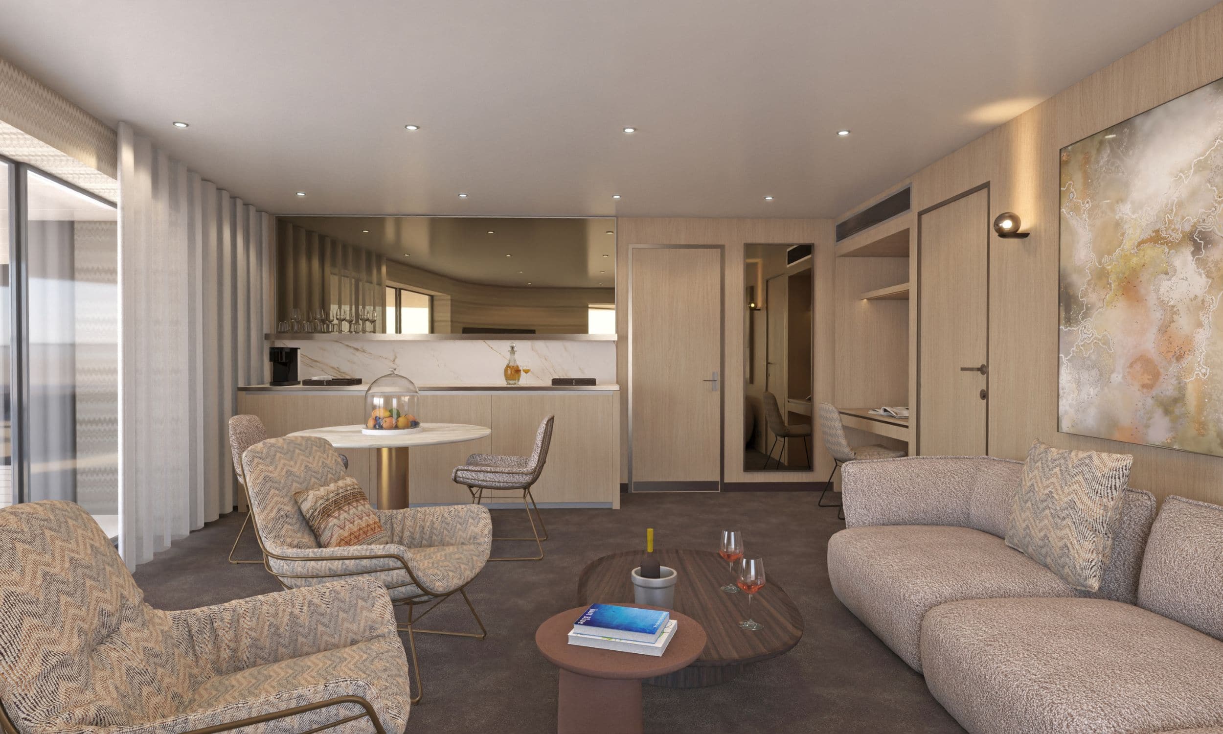 - 64 großzügige Suiten für 128 Gäste – mit privatem Balkon oder Panoramafensterfront – Ihr Rückzugsort zwischen Meetings, Landgängen und Abend-Event